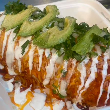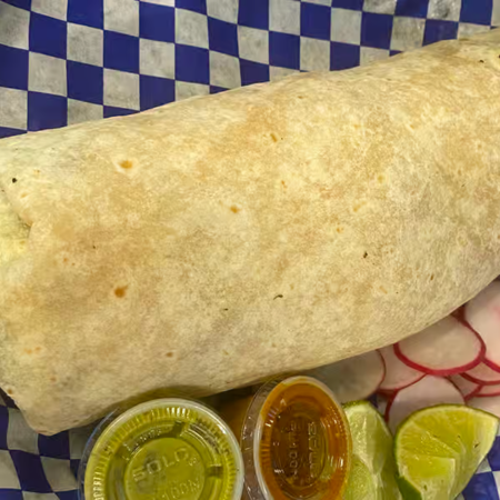 Includes choice of meat, rice, beans, onions, cilantro, cheese, lettuce, sour cream and guacamole
